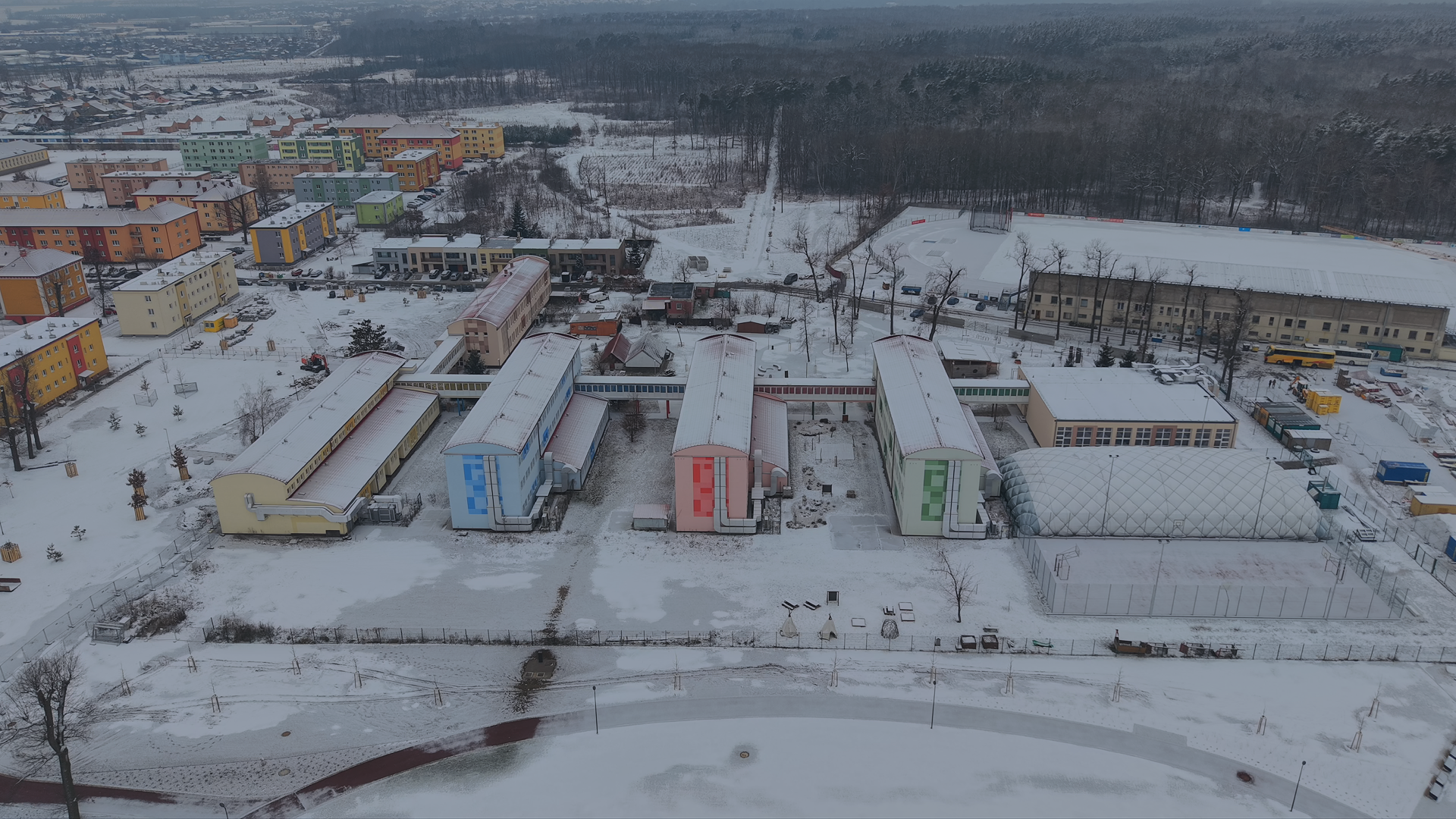 Sportovní areál mimo sezónu se zasněženou plochou a okolím.