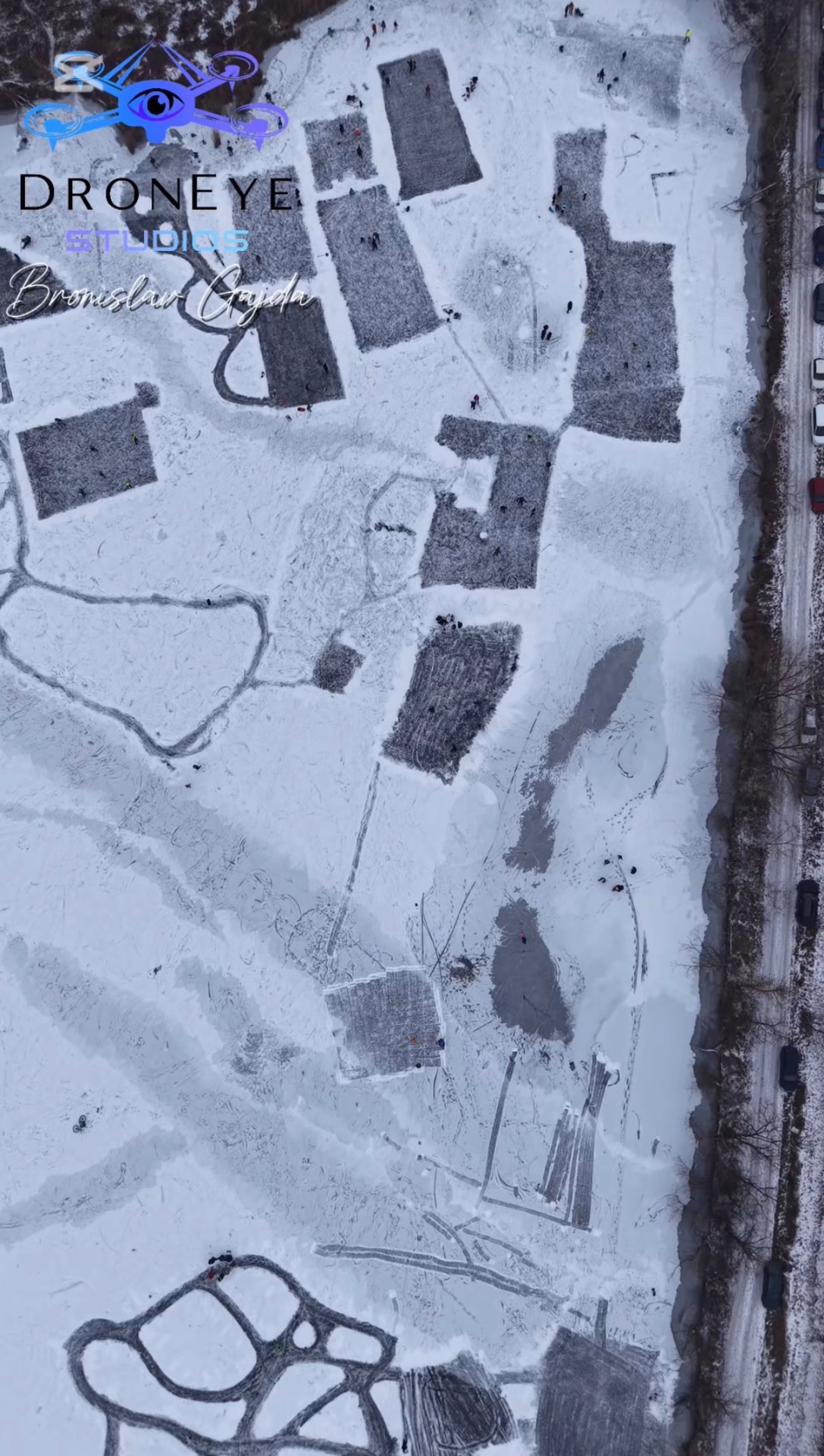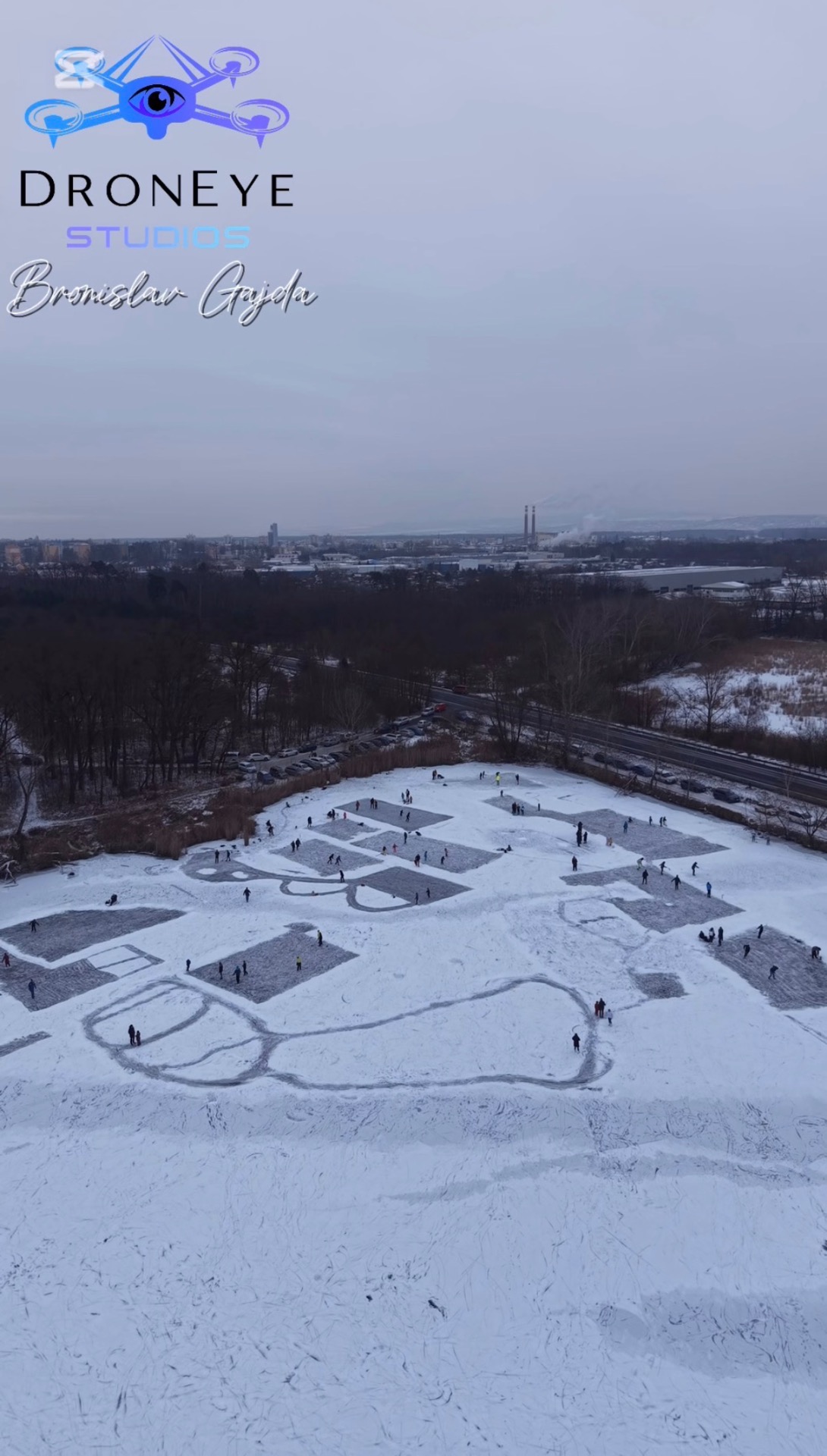 Z výšky je krásně vidět pohyb lidí po ledě, velikost celé plochy i jedinečný kontrast bílé zimní krajiny.